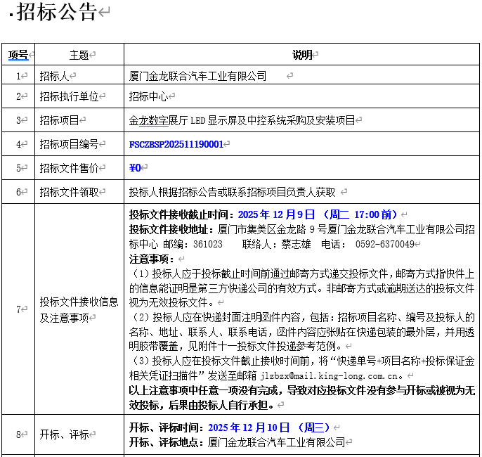 公开招标招标公告-金龙数字展厅LED显示屏及中控系统采购及安装项目